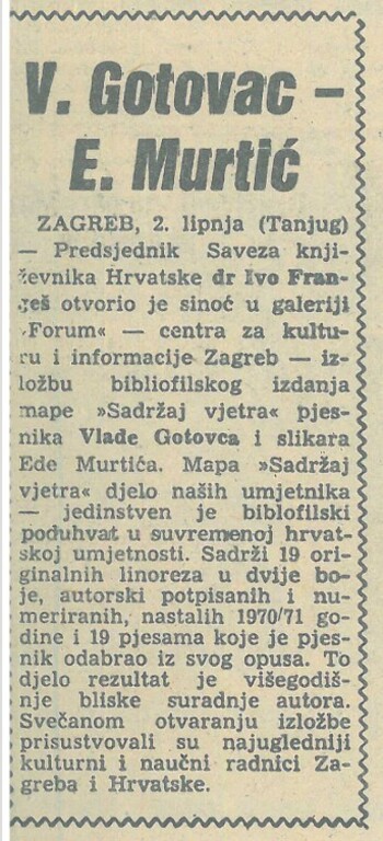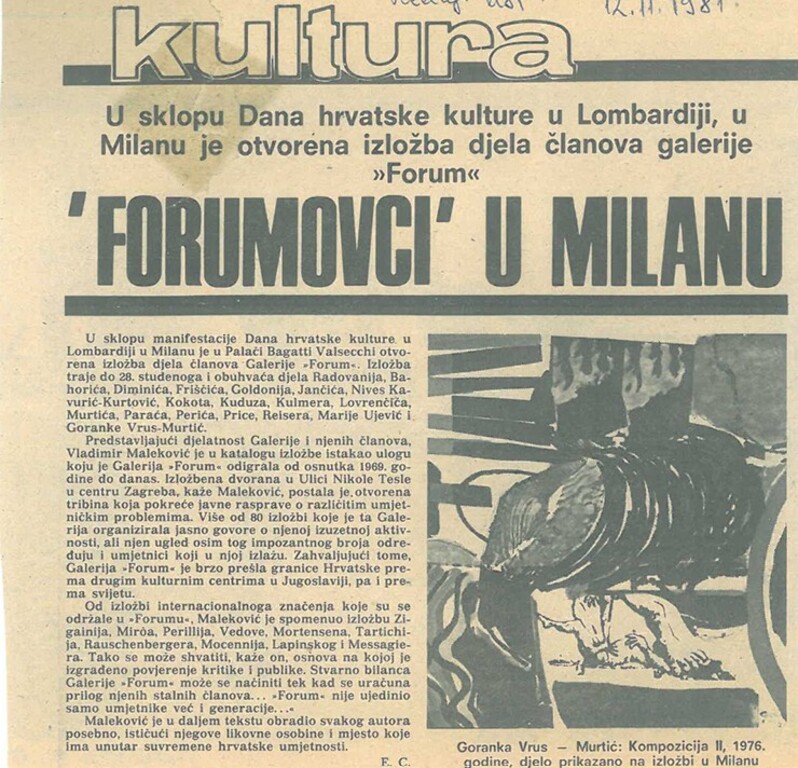Galerija Forum osnovana je unutar zagrebačkog Centra za kulturu i informacije. Na inicijativu Ede Murtića, slikara s izrazito značajnim društvenim kapitalom i uz umjetnike: Kostu Angelija Radovanija, Belizara Bahorića, Raoula Goldonija, Kseniju Kantoci, Antu Kuduza, Ferdinanda Kulmera, Ivana Lovrenčića, Stevana Luketića, Virgilija Nevjestića, Otona Postružnika, Zlatka Pricu, Nikolu Reisera i Franu Šimunovića, Galerija Forum počela je djelovanje u Teslinoj 16, 14. 7. 1969., kao prodajna galerija koja predstavlja ostvarenja svojih članova, ali i drugih (jugoslavenskih i svjetskih) umjetnika.