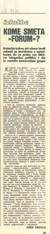 Galerija Forum bila je vibrantno mjesto u kojemu se zrcalio duh druge polovine 20. stoljeća u Jugoslaviji u svoj svojoj živahnosti i svim svojim proturječjima. U njoj su se presijecali modernizam u umjetnosti, socijalizam (makar nominalni) u samoupravljačkoj strukturi i, ne najmanje važno, tržišna misija koja je bila i razlog njezina osnivanja.