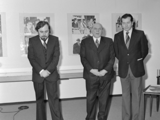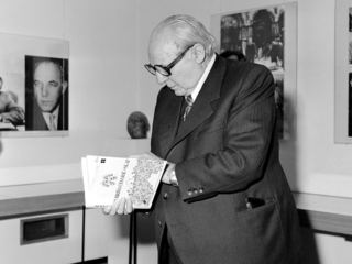 Dobriša Cesarić dobiva nagradu za svoje stvaralaštvo u Centru za kulturu i informacije. Fotografije voditelja programa i fotografija Dobriše Cesarića sa nagradom.