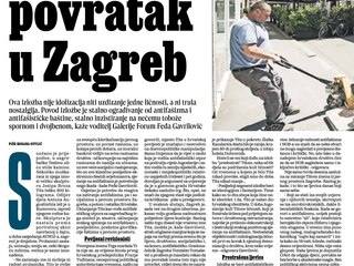 Novinski članak o izložbi "Sjećanje na pobjed - Trg maršala Tita", fotografije unošenja Augustinčičevog kipa te unutrašnjost Galerije Forum za vrijeme izožbe. Fotografije je snimio Mario Kučera.