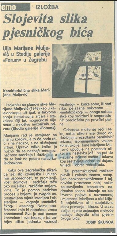 srpanj 1976. SLOJEVITA SLIKA PJESNIČKOG BIĆA, Marijana Muljević, Studio Galerije Forum Vrsta dokumenta: Novinski članak Djelatnost: Galerijska djelatnost Autor: Škunca, Josip Večernji list, 17. srpnja 1976.Autor: Škunca JosipOsvrt na izložbu Marijane Muljević koja se održala u Studiju Galerije Forum.