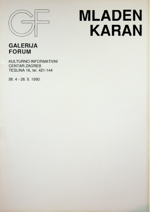 travanj 1990. MLADEN KARAN, Mladen Karan, Galerija Forum Vrsta dokumenta: Katalog Djelatnost: Galerijska djelatnost Autor: Maroević, Tonko Karan, Mladen Galerija Forum, 26. travnja - 26. svibnja 1990.Autor predgovora: Tonko MaroevićKatalog izložbe Mladena Karana u Galeriji Forum Preuzmi dokument