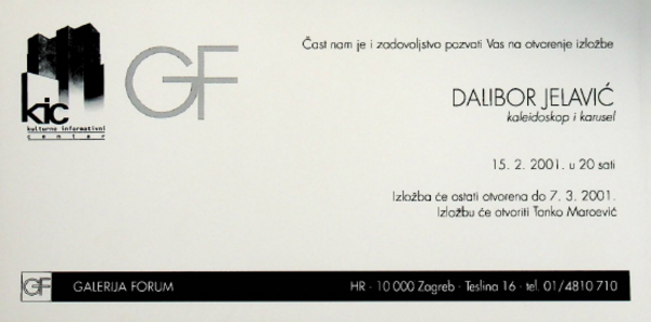 veljača 2001. DALIBOR JELAVIĆ, Dalibor Jelavić, Galerija Forum Vrsta dokumenta: Pozivnica Djelatnost: Izdavaštvo Galerijska djelatnost Autor: Maroević, Tonko Jelavić, Dalibor Galerija Forum, 15. veljače 2001.Autor predgovora: Tonko MaroevićPozivnica izložbe Dalibora Jelavić u Galeriji Forum Preuzmi dokument