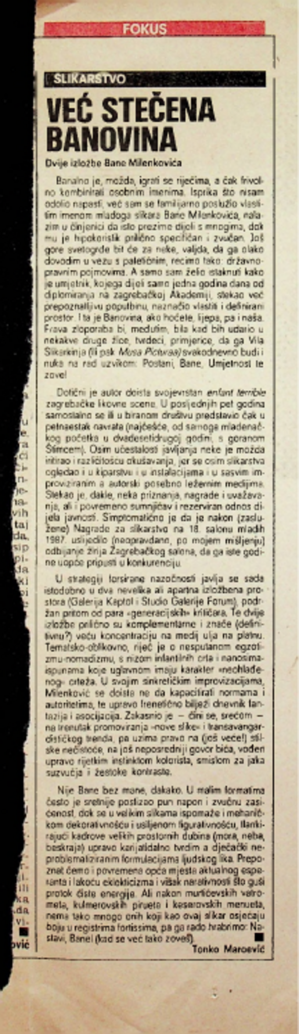 lipanj 1989. VEĆ STEČENA BANOVINA, Bane Milenković, Studio Galerije Forum Vrsta dokumenta: Novinski članak Djelatnost: Galerijska djelatnost Autor: Maroević, Tonko Vjesnik, 13. lipnja 1989.Autor: Tonko MaroevićIzložba Bane Milenkovića koja se održala u Studiu Galerije Forum. Preuzmi dokument