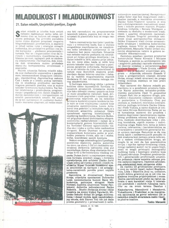 listopad 1989. MLADOLIKOST I MLADOLIKOVNOST, Grupna izložba, Galerija Forum Vrsta dokumenta: Novinski članak Djelatnost: Galerijska djelatnost Autor: Maroević, Tonko Vjesnik, 31. listopada 1989.Autor: Tonko MaroevićSalon mladih, umjetnički paviljon u Zagrebu.