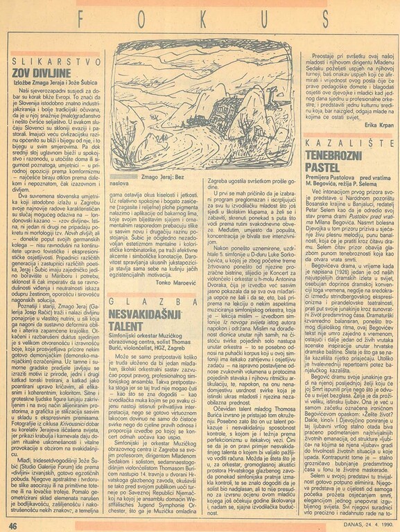 travanj 1990. ZOV DIVLJINE, Zmag Jeraj i Joža Šubić, Studio Galerije Forum Vrsta dokumenta: Novinski članak Djelatnost: Galerijska djelatnost Autor: Maroević, Tonko DANAS, 24. travnja 1990.Autor: Tonko MaroevićOsvrt na izložbu Zmaga Jeraja koja je održana u Galeriji Josip Račić i izložbu Jože Šubića koja je održana u Studiju Galerije Forum.