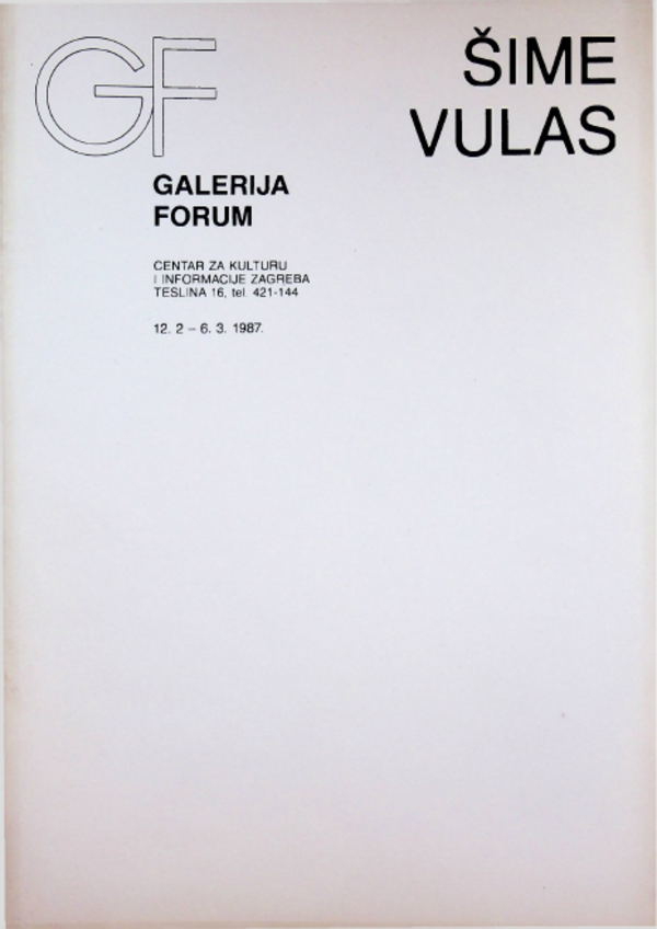 veljača 1987. ŠIME VULAS, Šime Vulas, Galerija Forum Vrsta dokumenta: Katalog Djelatnost: Izdavaštvo Galerijska djelatnost Autor: Maković, Zvonko Vulas, Šime Galerija Forum, 12. veljače 1987.Autor predgovora: Zvonko MakovićKatalog izložbe Šime Vulasa u Galeriji Forum Preuzmi dokument