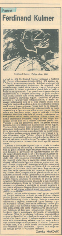 siječanj 1984. FERDINAND KULMER, Ferdinand Kulmer, Galerija Forum Vrsta dokumenta: Novinski članak Djelatnost: Galerijska djelatnost Autor: Maković, Zvonko OKO, 17. siječnja 1984.Autor: Zvonko MakovićOsvrt na izložbu Ferdinanda Kulmera koja se odvila u siječnju 1984. u Galeriji Forum. Preuzmi dokument
