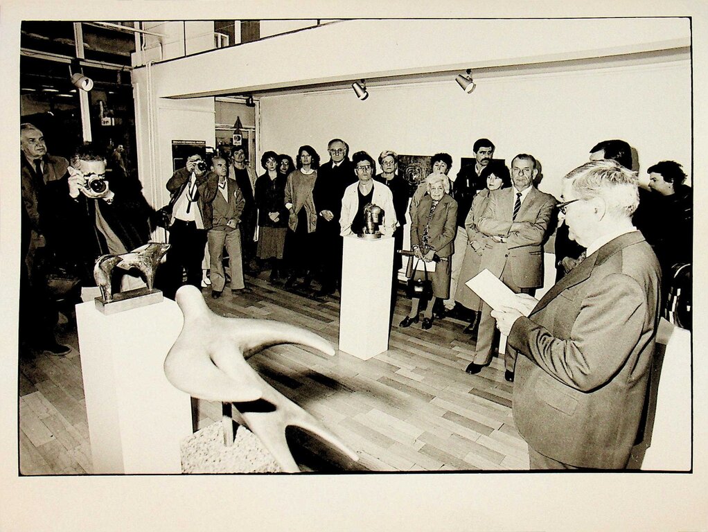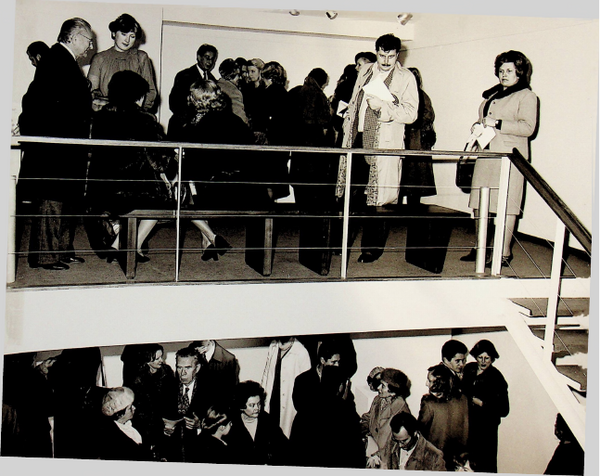 Željko Sabol autor kataloga Živa Kraus-slike, drži otvorenje. Na fotografiji su: slijeva, Tonko Maroević, Živa Kraus, Željko Sabol, Saša Vereš, Dušan Pavlović i Edo Murtić.