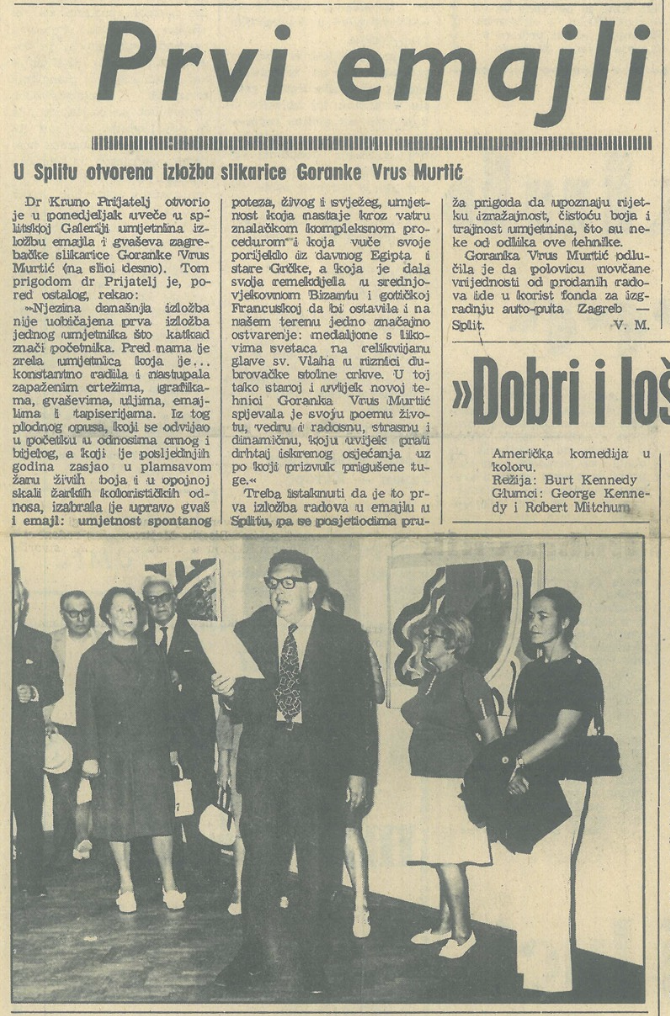 lipanj 1972. PRVI EMAJLI, Goranka Vrus-Murtić Vrsta dokumenta: Novinski članak Djelatnost: Galerijska djelatnost Autor: Autor, Nepoznat 1. SLOBODNA DALMACIJA, 17. lipnja 1972.Autor: V.M.U Splitu otvorena izložba slikarice Goranke Vrus - Murtić. Preuzmi dokument