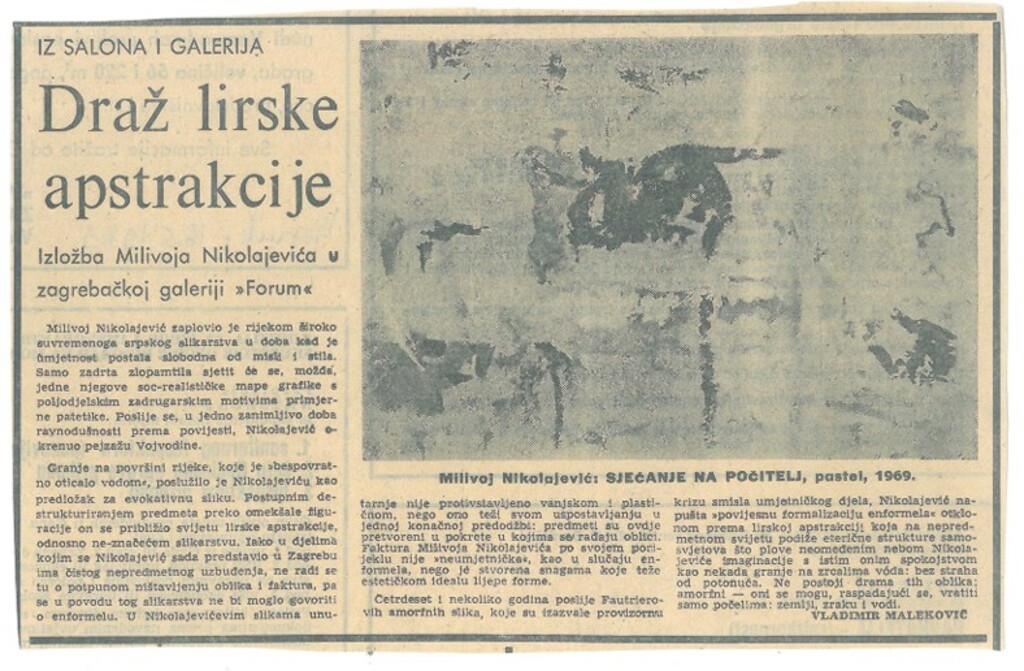 lipanj 1973. DRAŽ LIRSKE APSTRAKCIJE, Milivoj Nikolajević, Galerija Forum Vrsta dokumenta: Novinski članak Djelatnost: Galerijska djelatnost Autor: Maleković, Vladimir OKO, 13. lipnja 1973.AUTOR: Vladimir MalenkovićOsvrt na izložbu Nikolajevića u Galeriji Forum.