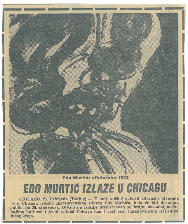 studeni 1972. EDO MURTIĆ IZLAŽE U CHICAGU, Edo Murtić Vrsta dokumenta: Novinski članak Djelatnost: Galerijska djelatnost Autor: Autor, Nepoznati 3. OKO, 25. studeni 1972.Autor nepoznatObavijest o izložbi u Chicagu Ede Murtića