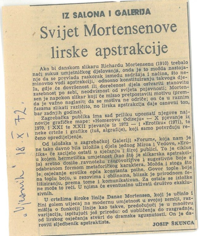 listopad 1972. SVIJET MORTENSENOVE LIRSKE APSTRAKCIJE, Josip Škunca, Galerija Forum Vrsta dokumenta: Novinski članak Djelatnost: Galerijska djelatnost Autor: Škunca, Josip VJESNIK, 18. listopada 1972.Autor: Josip ŠkuncaIzložba Mortensena u Galeriji Forum.
