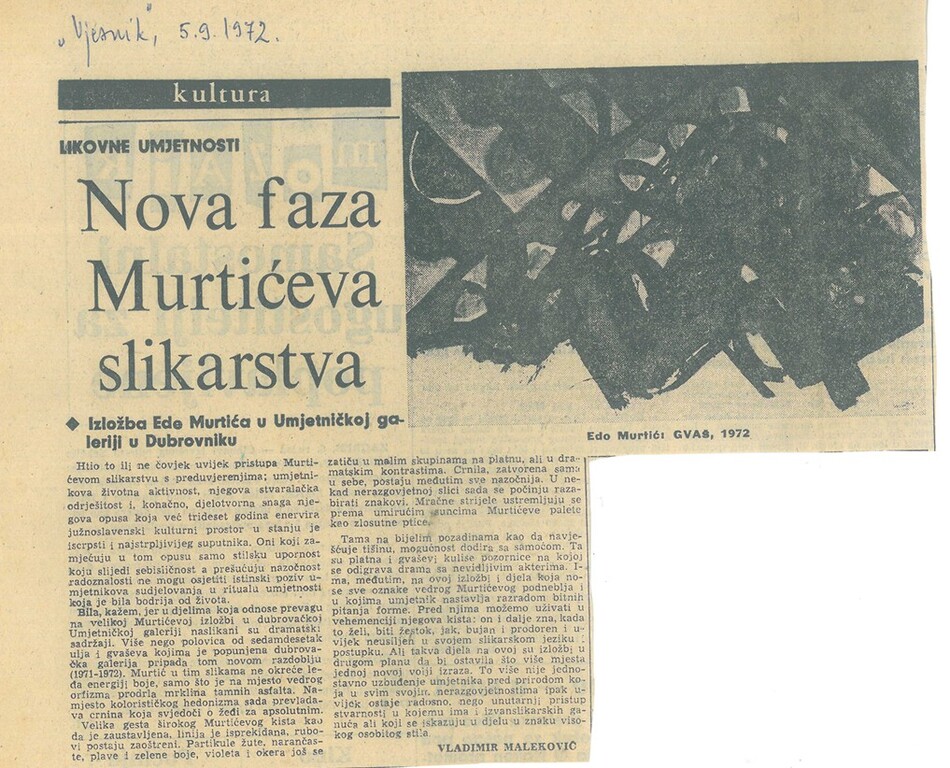 rujan 1972. NOVA FAZA MURTIĆEVA SLIKARSTVA, Vladimir Malenković, Galerija Forum Vrsta dokumenta: Novinski članak Djelatnost: Galerijska djelatnost Autor: Maleković, Vladimir Vjesnik, 05.rujna 1972.Autor: Vladimir MalekovićIzložba Ede Murtića u Dubrovniku.