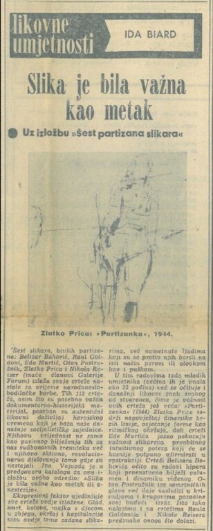 prosinac 1971. SLIKA JE BILA VAŽNA KAO METAK, Grupna izložba, Galerija Forum Vrsta dokumenta: Novinski članak Djelatnost: Galerijska djelatnost Autor: Biard, Ida LIKOVNE UMJETNOSTI, 13. prosinca 1971.Autor: Ida BiardOsvrt na izložbu šest slikara koja se odvila u Galeriji Forum.
