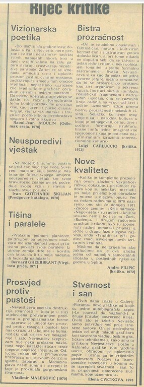 siječanj 1974. RIJEČ KRITIKE, Virgilije Nevjestić, Galerija Forum Vrsta dokumenta: Novinski članak Djelatnost: Galerijska djelatnost Autor: Maleković, Vladimir Cvetkova, Elena Moulin, Raoul-Jean Carluccio, Luigi Gotthardi Škiljan, Ivan ... Vjesnik, 20. siječnja 1974.Autor: Elena CvetkovaRiječ kritike, razni kritički osvrti na radove Virgilija Nevjestića.