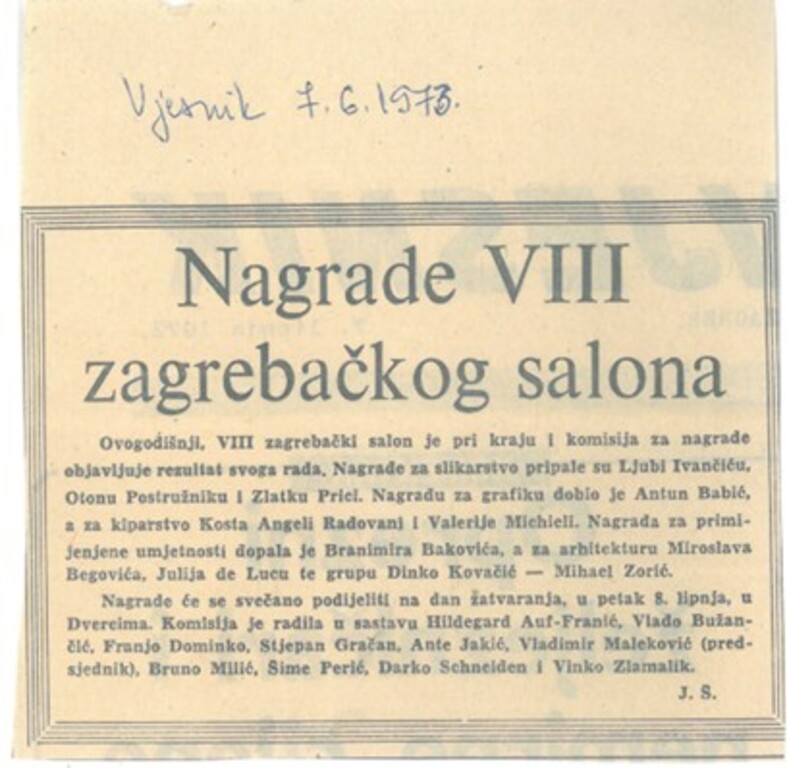 lipanj 1973. NAGRADE VII ZAGREBAČKOG SALONA, Kosta Angeli Radovani, Galerija Forum Vrsta dokumenta: Novinski članak Djelatnost: Galerijska djelatnost Autor: Autor, Nepoznati 3. Vjesnik, 07. lipnja 1973.Autor nepoznatNagrade VIII. zagrebačkog salona, te nagrada koja je dodijeljena Kosti Angeli Radovaniju.