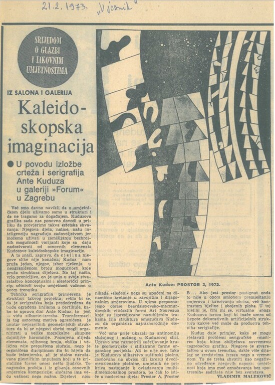 veljača 1973. KALEIDOSKOPSKA IMAGINACIJA, Ante Kuduz, Galerija Forum Vrsta dokumenta: Novinski članak Djelatnost: Izdavaštvo Galerijska djelatnost Autor: Maleković, Vladimir VJESNIK, 21.veljače 1973.Autor: Vladimir MalekovićOsvrt na izložbu ''Kaleidoskopska imaginacija', Ante Kuduza u Galeriji Forum.