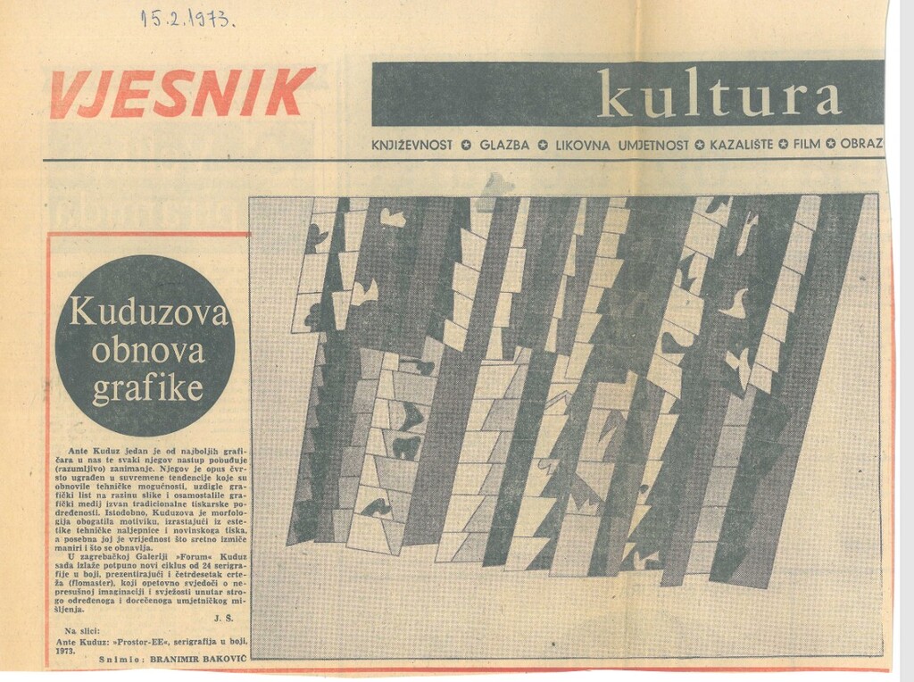 veljača 1973. KUDUZOVA OBNOVA GRAFIKE, Ante Kuduz, Galerija Forum Vrsta dokumenta: Novinski članak Djelatnost: Galerijska djelatnost Autor: Škunca, Josip VJESNIK, 15. veljače 1973.AUTOR: JOSIP ŠKUNCAOsvrt na Kuduzovu izložbu u Galeriji Forum,
