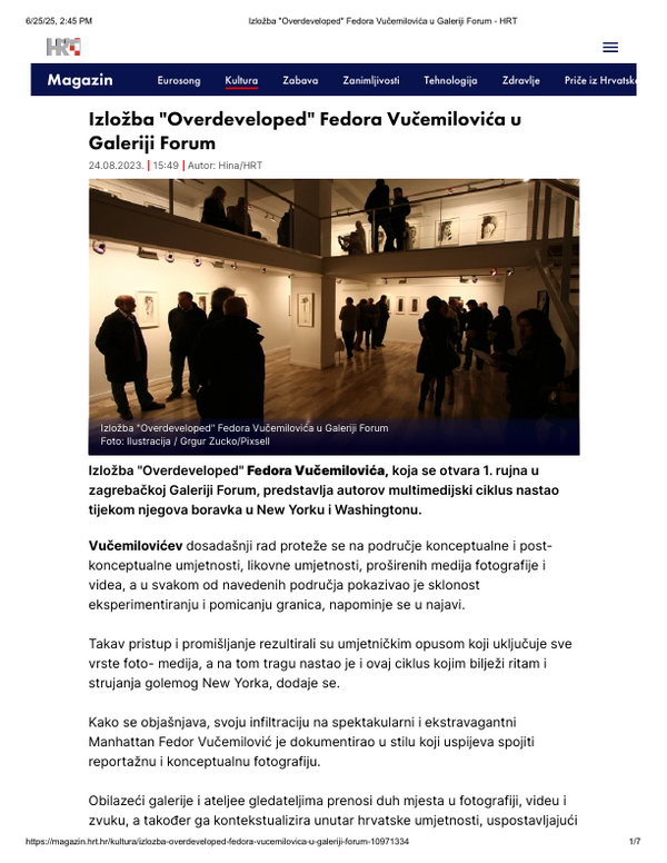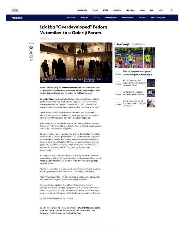 rujan 2023. OVERDEVELOPED, Fedor Vučemilović, Galerija Forum Vrsta dokumenta: Novinski članak Djelatnost: Fotografska arhiva Galerijska djelatnost Jutarnji list, 12. rujna 2023.Autor: Patricia KišIzložba Fedora Vučemilovića koja se održala u Galeriji Forum. Preuzmi dokument
