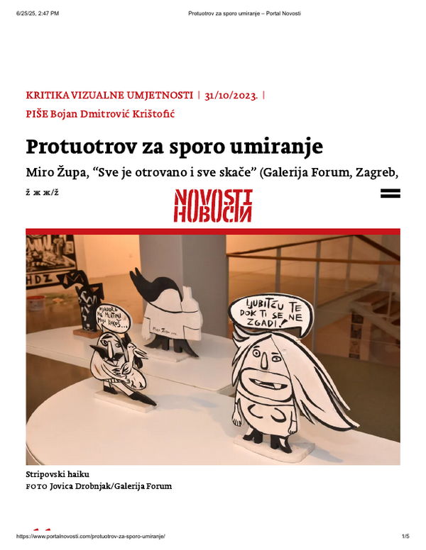 listopad 2023. SVE JE OTROVANO I SVE SKAČE, Miro Župa, Galerija Forum Vrsta dokumenta: Novinski članak Djelatnost: Galerijska djelatnost Jutarnji list, 11. listopada 2023.Autor: Patricia KišIzložba Mire Župana koja se održala u Galeriji Forum. Preuzmi dokument