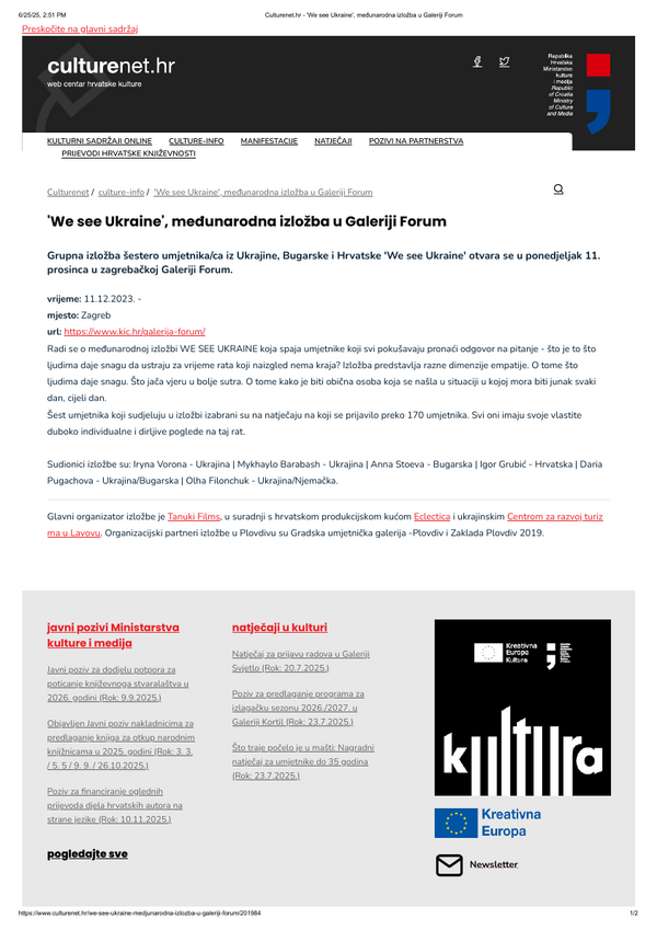 prosinac 2023. WE SEE UKRAINE, Međunarodna izložba, Galerija Forum Vrsta dokumenta: Novinski članak Djelatnost: Galerijska djelatnost Culturenet, 11. prosinca 2023.Autor: nepoznatMeđunarodna izložba koja se održala u Galeriji Forum. Preuzmi dokument