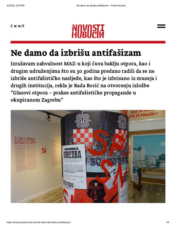 lipanj 2023. GLASOVI OTPORA - PRAKSE ANTIFAŠISTIČKE BORBE U OKUPIRANOM ZAGREBU, Saša Vejzagić i Karlo Držaić, Galerija Forum Vrsta dokumenta: Novinski članak Djelatnost: Galerijska djelatnost Jutarnji list, 22. lipnja 2023.Autor: Vlado VurušićIzložba Saše Vejzagića i Karla Držaića koja se održala u Galeriji Forum. Preuzmi dokument