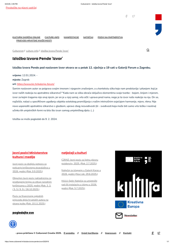 siječanj 2024. IZVOR, Izvor Pende, Galerija Forum Vrsta dokumenta: Novinski članak Djelatnost: Galerijska djelatnost Culturenet, 12. siječnja 2024.Autor: nepoznatIzložba Izvora Pende koja se održala u Galeriji Forum. Preuzmi dokument