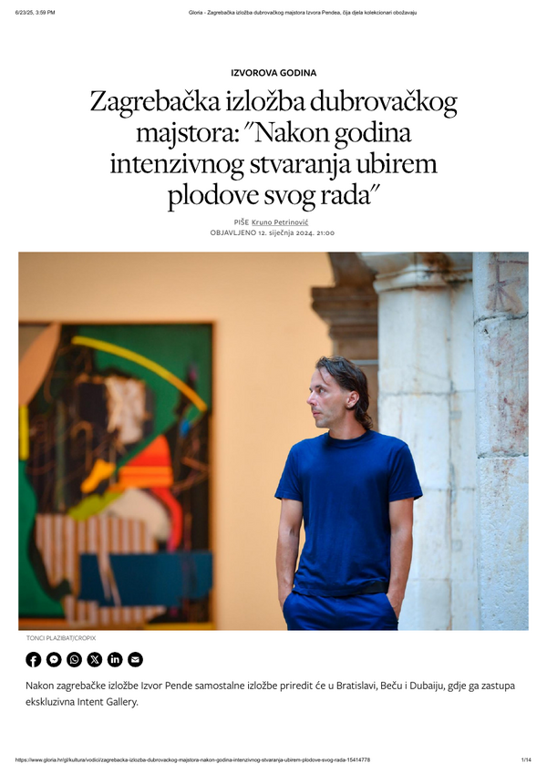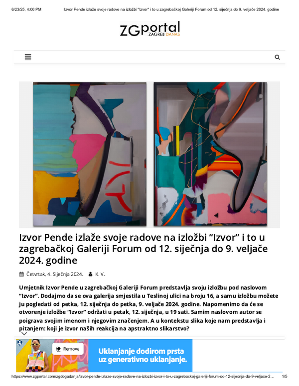 siječanj 2024. IZVOR, Izvor Pende, Galerija Forum Vrsta dokumenta: Novinski članak Djelatnost: Galerijska djelatnost ZGportal, 12. siječnja 2024.Autor: K.V.Izložba Izvora Pende koja se održala u Galeriji Forum. Preuzmi dokument