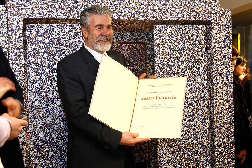 svibanj 2007. JOŠKO ETEROVIĆ, NAGRADA, Galerija Forum, KIC Vrsta dokumenta: Fotografija Djelatnost: Fotografska arhiva Razgovori/Susreti Izdavaštvo Galerijska djelatnost Galerija Forum11. svibnja 2007.Dodjela Nagrade Galerije Forum, dodjeljena je Jošku Eterovicu. Na fotografiji je slikar Eeterović sa nagradom.
