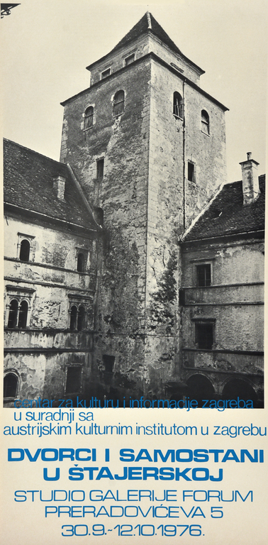 rujan 1976. DVORCI I SAMOSTANI U ŠTAJERSKOJ, Grupna izložba, Studio Galerije Forum Vrsta dokumenta: Plakat Djelatnost: Izdavaštvo Galerijska djelatnost Autor: Stančin, Ivo Studio Galerije Forum, 30. rujna 1976. Plakat grupne izložbe koja je održana u Studiu Galerije Forum