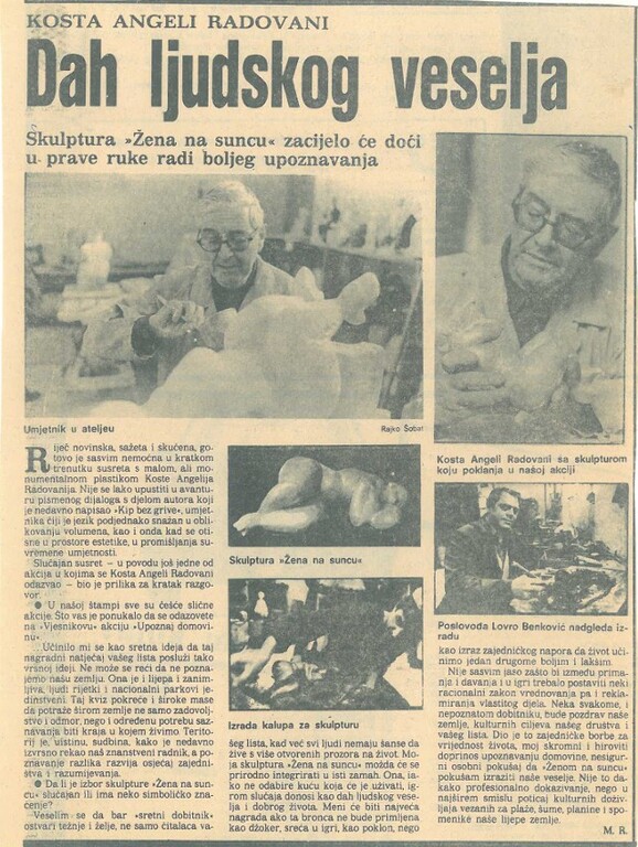 studeni 1986. DAH LJUDSKOG VESELJA, Kosta Angeli Radovani Vrsta dokumenta: Novinski članak Djelatnost: Galerijska djelatnost Autor: Autor, Nepoznat 1. Vjesnik, 16. studenog 1986.Autor: nepoznatNaziv rubrike: Dah ljudskog veseljaKratki intervju s Kostom Angeli Radovanijem te osvrt na njegove radove.