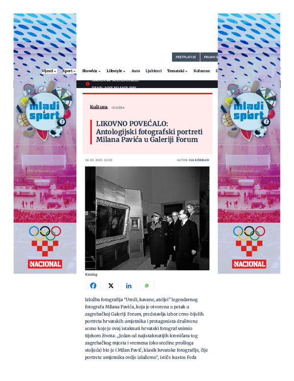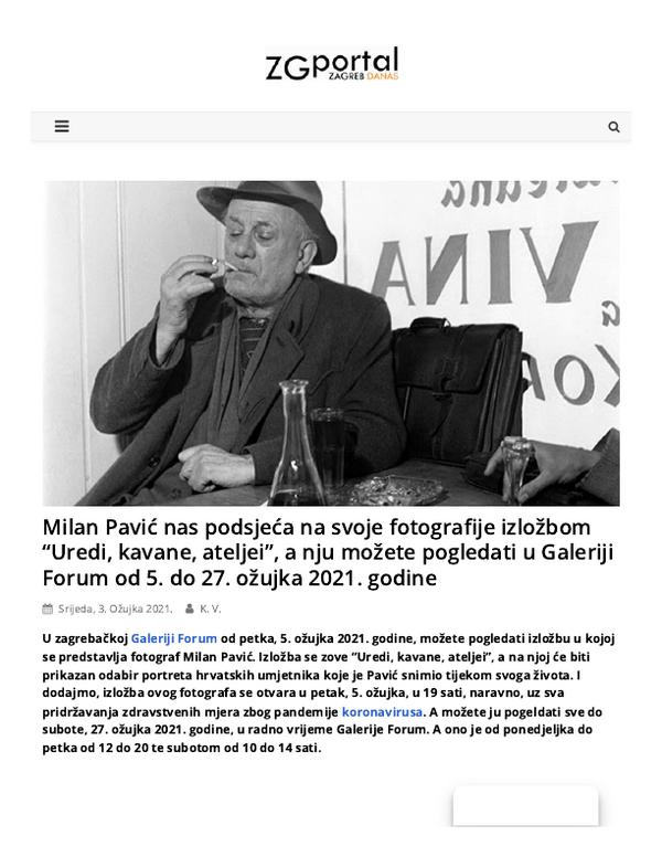 ožujak 2021. UREDI, KAVANE, ATELJEI, Milan Pavić, Galerija Forum Vrsta dokumenta: Novinski članak Djelatnost: Galerijska djelatnost ZGportal, 03. ožujka 2021.Autor: K.V.Izložba Milana Pavića koja se održala u Galeriji Forum. Preuzmi dokument