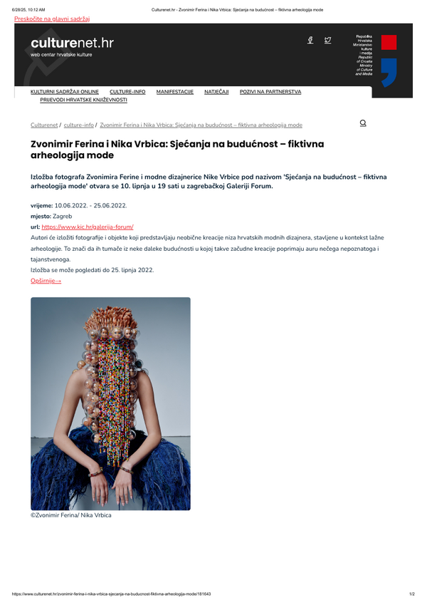 lipanj 2022. SJEĆANJA NA BUDUĆNOST, FIKTIVNA ARHEOLOGIJA MODE, Zvonimir Ferina i Nika Vrbica, Galerija Forum Vrsta dokumenta: Novinski članak Djelatnost: Galerijska djelatnost 24 sata, 11. lipnja 2022.Autor: nepoznatIzložba Zvonimira Ferine i Nike Vrbice koja se održala u Galeriji Forum. Preuzmi dokument
