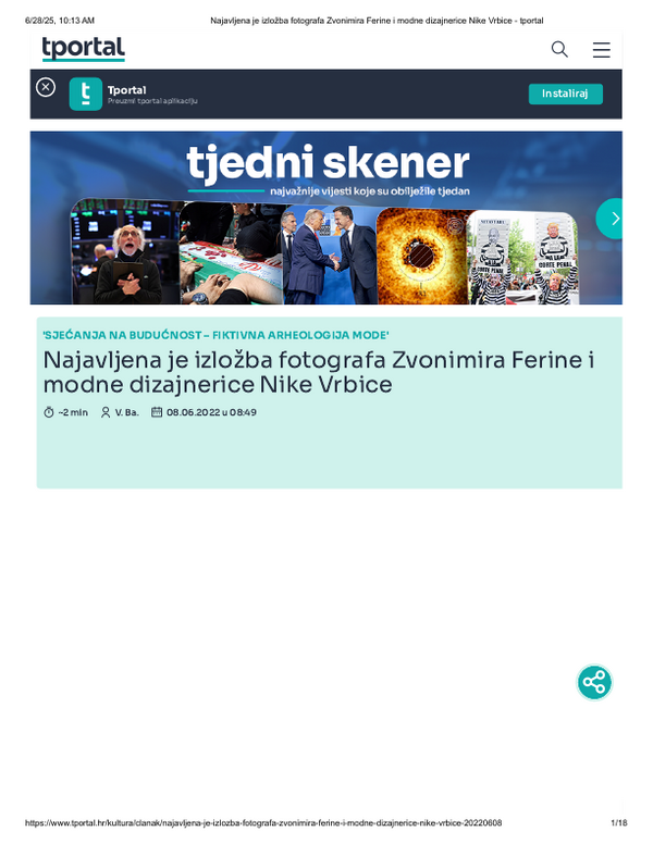 lipanj 2022. SJEĆANJA NA BUDUĆNOST, FIKTIVNA ARHEOLOGIJA MODE, Zvonimir Ferina i Nika Vrbica, Galerija Forum Vrsta dokumenta: Novinski članak Djelatnost: Galerijska djelatnost Jutarnji list, 10. lipnja 2022.Autor: Tena ŠarčevićIzložba Zvonimira Ferine i Nike Vrbica koja se održala u Galeriji Forum. Preuzmi dokument