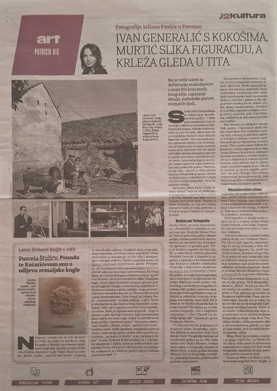 ožujak 2021. IVAN GENERALIĆ S KOKOŠIMA, MURTIĆ SLIKA FIGURACIJU, A KRLEŽA GLEDA U TITA, Grupna izložba, Galerija Forum Vrsta dokumenta: Novinski članak Djelatnost: Galerijska djelatnost Autor: Kiš, Patricia Jutarnji list, 17. ožujka 2021.Autor: Patricia KišČlanak o grupnoj izložbi koja se održala u Galeriji Forum.