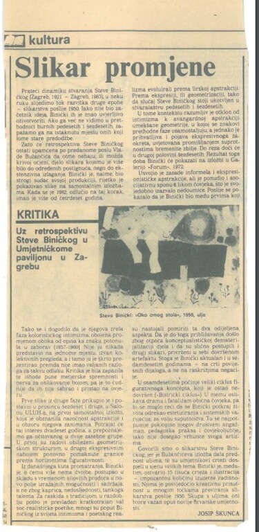 lipanj 1986. SLIKAR PROMJENE, Stevo Binički, Umjetnički paviljon u Zagrebu Vrsta dokumenta: Novinski članak Djelatnost: Galerijska djelatnost Autor: Škunca, Josip Vjesnik, 17. lipnja 1986.Autor: josip ŠkuncaNaziv rubrike: Slikar promjeneKomentar i kritika na izložbu Steve Biničkog koja se održala u Umjetničkom paviljonu u Zagrebu.