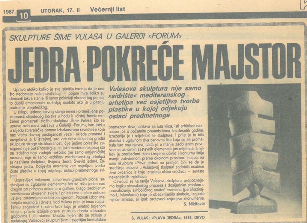 veljača 1987. JEDRA POKREĆE MAJSTOR, Šime Vulas, Galerija Forum Vrsta dokumenta: Novinski članak Djelatnost: Galerijska djelatnost Autor: Nikitović, Spomenka Večernji list, 17.veljače 1987.Autor: Spomenka Nikitović"Jedra pokreće majstor"Osvrt na izložbu Šime Valusa koja se održala u Galeriji Forum u veljači 1987.
