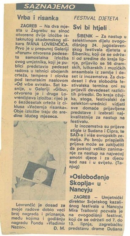 veljača 1984. VRBA I RISANKA, Ivan Lovrenčić, Galerija Forum i Galerija Gibu Vrsta dokumenta: Novinski članak Djelatnost: Galerijska djelatnost Večernji list, 22. veljače 1984.Autor: Đ.M.Naziv rubrike: Vrba i risankaOsvrt na dvije izložbe Ivana Lovrenčića održane u Galeriji Forum i Galeriji Gibu.