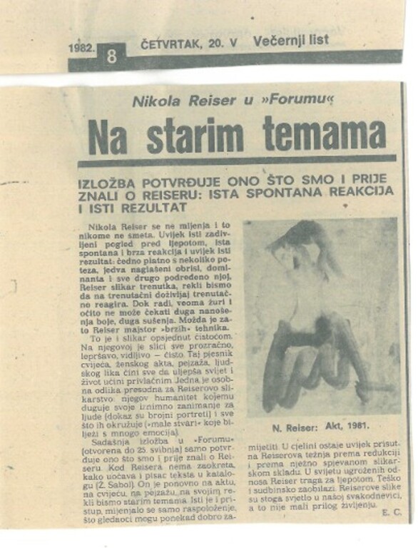 svibanj 1982. NA STARIM TEMAMA, Nikola Reiser, Galerija Forum Vrsta dokumenta: Novinski članak Djelatnost: Galerijska djelatnost Autor: Autor, Nepoznat 1. Večernji list, 20. svibnja 1982.Autor: E. C.Osvrt na izložbu Nikole Reisera u Galeriji Forum.
