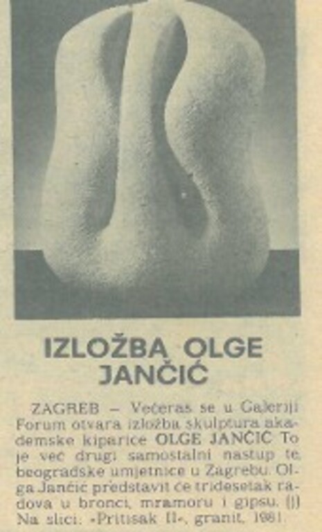rujan 1982. IZLOŽBA OLGE JANČIĆ, Olga Jančić, Galerija Forum Vrsta dokumenta: Novinski članak Djelatnost: Galerijska djelatnost Autor: Autor, Nepoznat 1. Večernji list, 17. rujna 1982Autor nepoznatObavijest o otvorenju izložbe skulptura Olge Jančić u Galeriji Forum.