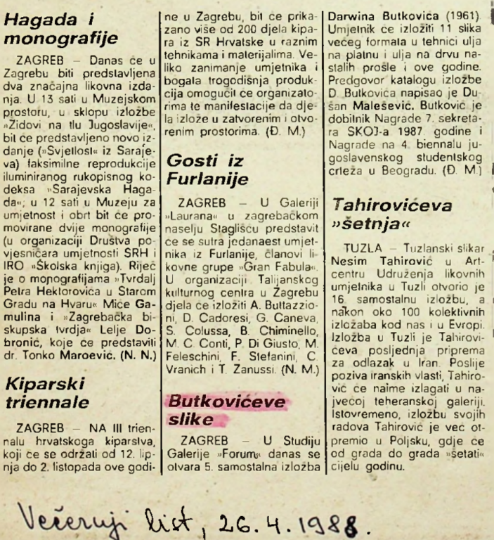 travanj 1988. DARWIN BUTKOVIĆ, Darwin Butković, Studio Galerije Forum Vrsta dokumenta: Novinski članak Djelatnost: Galerijska djelatnost Večernji list, 26. travnja 1988.Autor: Đ.M.Naziv članka: "Butkovićeve slike"Izložba Darwina Butkovića koja se održala u Studiju Galerije Forum.