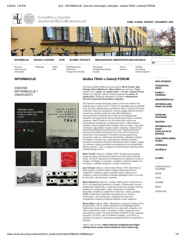 veljača 2023. TRAG, Mario Čaušić, Igor Čabraja, Mario Matoković i Miran Šabić, Galerija Forum Vrsta dokumenta: Novinski članak Djelatnost: Galerijska djelatnost ALU, 10. veljače 2023.Autor: nepoznatGrupna izložba koja se održala u Galeriji Forum. Preuzmi dokument