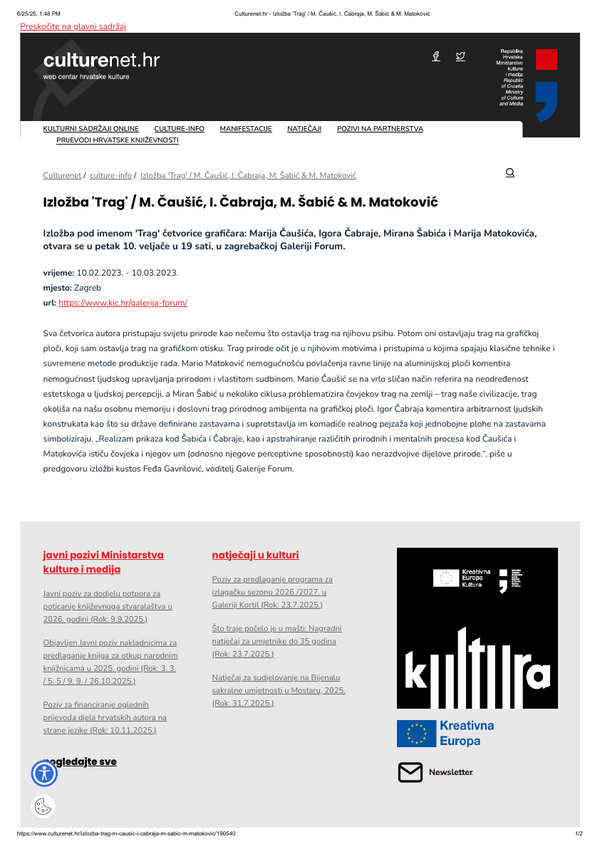 veljača 2023. TRAG, Mario Čaušić, Igor Čabraja, Mario Matoković i Miran Šabić, Galerija Forum Vrsta dokumenta: Novinski članak Djelatnost: Galerijska djelatnost Culturenet, 10. veljače 2023.Autor: nepoznatGrupna izložba koja se održala u Galeriji Forum. Preuzmi dokument