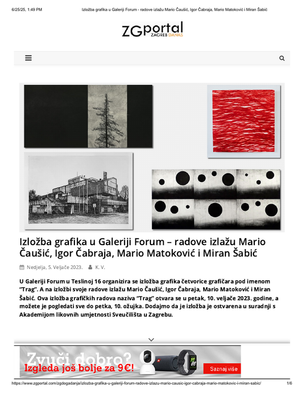 veljača 2023. TRAG, Mario Čaušić, Igor Čabraja, Mario Matoković i Miran Šabić, Galerija Forum Vrsta dokumenta: Novinski članak Djelatnost: Galerijska djelatnost ZGportal, 05. veljače 2023.Autor: K.V.Grupna izložba koja se održala u Galeriji Forum. Preuzmi dokument