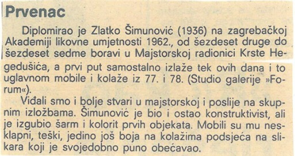 studeni 1978. PRVENAC, Zlatko Šimunović, Galerija Forum Vrsta dokumenta: Novinski članak Djelatnost: Galerijska djelatnost Autor: Škunca, Josip Vjesnik, 18. studenog 1978.Autor: Josip Škunca"Prvenac"Osvrt na izložbu Zlatka Šimunovića koja se odvila u studiju galeriji Forum koja se odvila u studenom 1978.