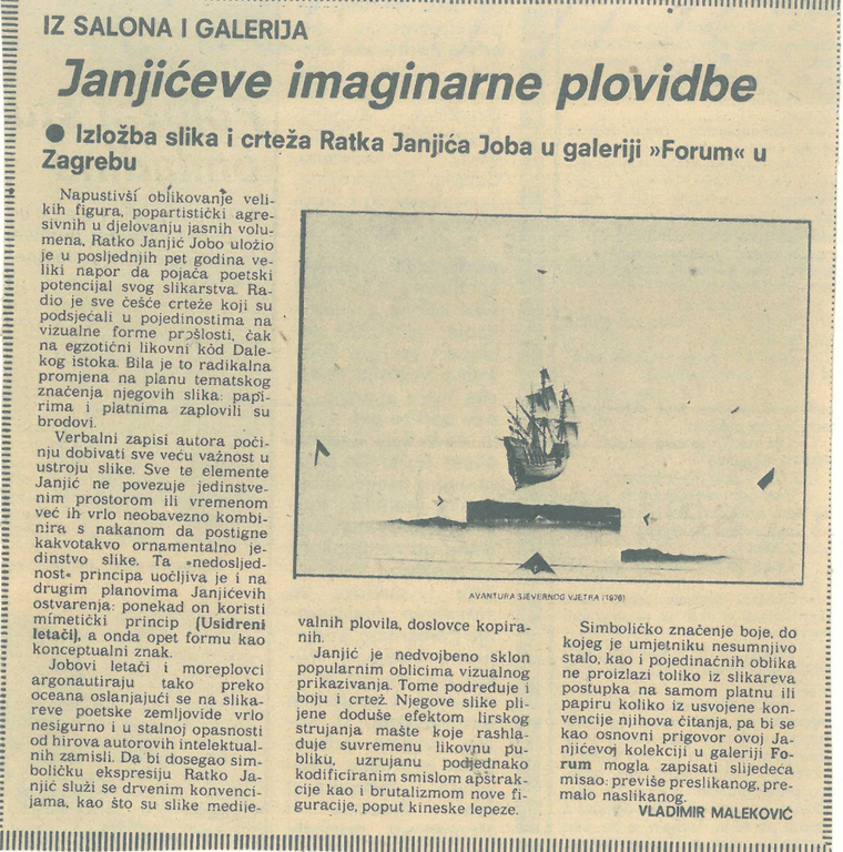 studeni 1978. JANJIĆEVE IMAGINARNE PLOVIDBE, Ratko Janjić-Jobo, Galerija Forum Vrsta dokumenta: Novinski članak Djelatnost: Galerijska djelatnost Autor: Maleković, Vladimir Vjesnik, 04. studenog 1978.Autor: Vladimir Maleković"Janjićeve imaginarne plovidbe"Osvrt na izložbu Ratka Janjić-Joba koja se odvila u Galeriji Forum od 19.10.1978. do 05.11.1978.