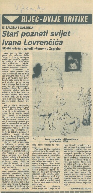 lipanj 1976. STARI POZNATI SVIJET IVANA LOVRENČIĆA, Ivan Lovrenčić, Galerija Forum Vrsta dokumenta: Novinski članak Djelatnost: Galerijska djelatnost Autor: Maleković, Vladimir Vjesnik, 17. lipnja 1976.Autor: Maleković VladimirOsvrt na izložbu Lovrenčića koja se održala u Galeriji Forum.
