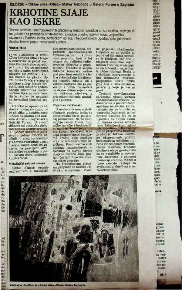 svibanj 2003. KRAHOTINE SJAJE KAO ISKRE, Matko Trebotić, Galerija Forum Vrsta dokumenta: Novinski članak Djelatnost: Galerijska djelatnost Vijenac, 01. svibnja 2003.Autor: Vlasta TolićIzložba Matka Trebotića koja se održala u Galeriji Forum. Preuzmi dokument