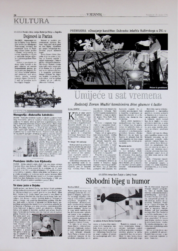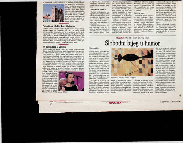 ožujak 2010. SLOBODNI BIJEG U HUMOR, Antun Boris Švaljek, Galerija Forum Vrsta dokumenta: Novinski članak Djelatnost: Galerijska djelatnost Vjesnik, 22. ožujka 2010.Autor: nepoznatIzložba Antuna Borisa Švaljeka koja je održana u Galeriji Forum. Preuzmi dokument